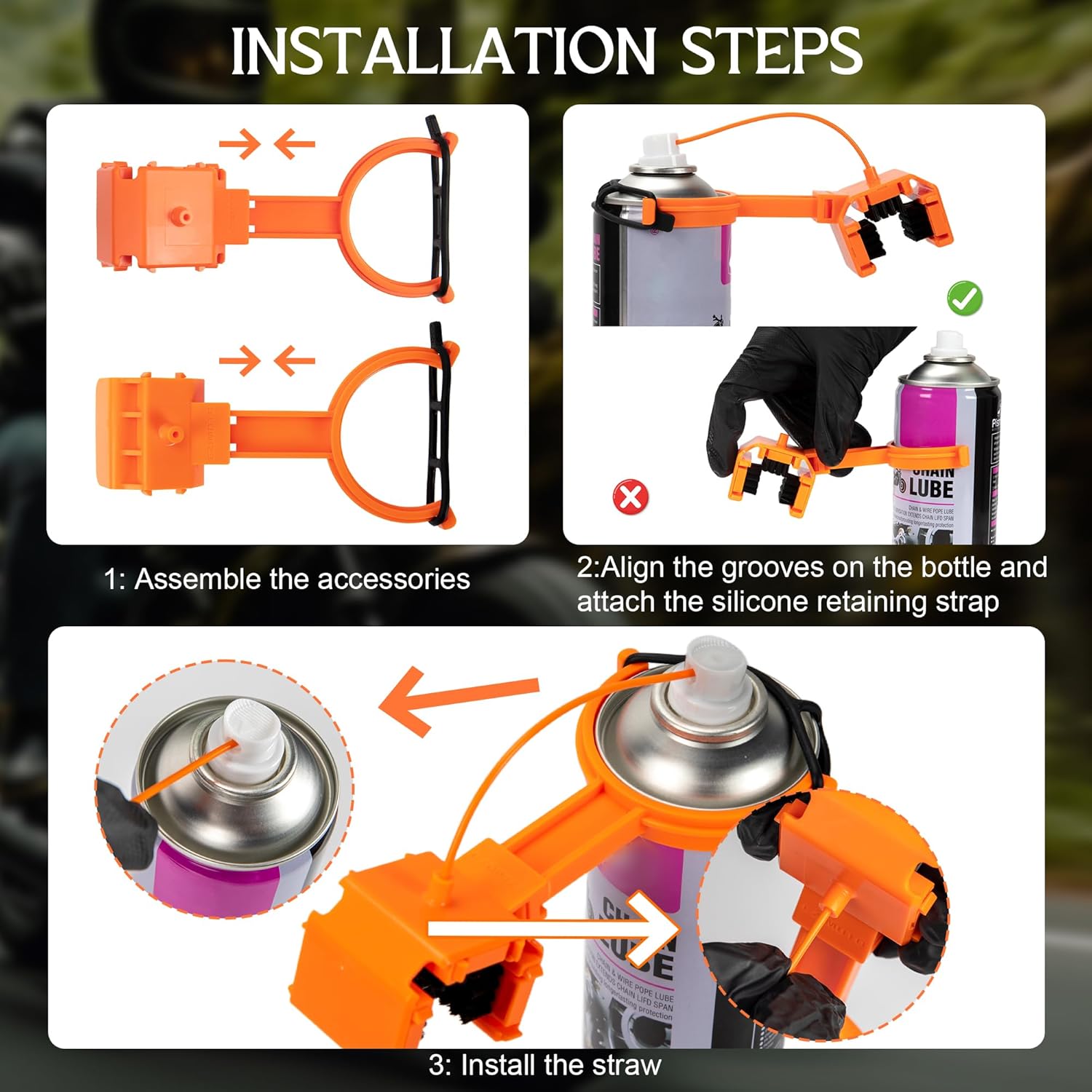 - 【Universal Fit for Most Motocycle and Bikes】 The motorcycle chain cleaning kit contains:1* chain cleaning brush, 1* chain oiler, 2* PE tubes, 1* cleaning cloth, a pair of gloves. Works with all major motorcycle chain sizes (428, 520, 525, 530) and most chain cleaner/lube iron aerosol cans. Please verify the can has top ring groove!