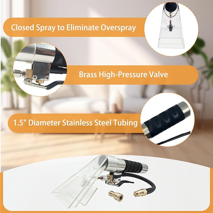 - 【 Important Tips 】The upholstery tool of a 4" detailing extractor wand, closed spray to eliminate overspray, 1.5" diameter stainless steel tubing, extractor vacuum head connects directly to the 1.5 inch vacuum hose, a high-pressure hose, and a standard 1/4" male quick-disconnect, steam clean vacuum wand built to last, plug-and-play connection