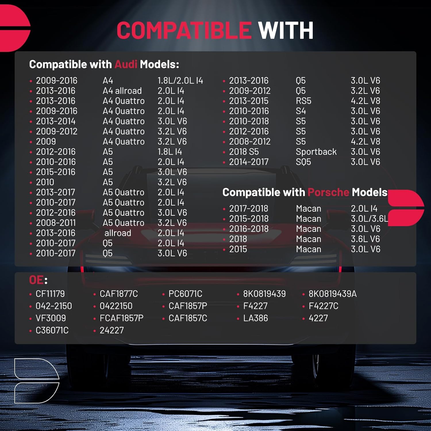 - [Replaces Part] CF11179, CAF1877C, PC6071C, 8K0819439, 8K0819439A, 042-2150, 0422150, CAF1857P, F4227, F4227C, VF3009, FCAF1857P, CAF1857C, LA386, 4227, C36071C, 24227. Compatible with Audi Models: 2013-2015 RS5 4.2L V8, 2010-2016 S4 3.0L V6, 2010-2018 S5 3.0L V6, 2008-2012 S5 4.2L V8, 2018 S5 Sportback 3.0L V6, 2014-2017 SQ5 3.0L V6; Compatible with Porsche Models: 2017-2018 Macan 2.0L l4, 2015-2018 Macan 3.0L V6, 2015-2018 Macan 3.6L V6