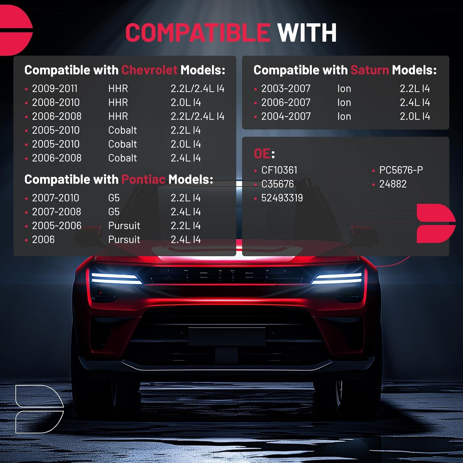 - [Vehicle Fitment] Compatible with Chevy Models: 2005-2010 Cobalt 2.0L/2.2L l4, 2006-2008 Cobalt 2.4L l4, 2008-2010 HHR 2.0L l4, 2006-2011 HHR 2.2L/2.4L l4; Compatible with Pontiac Models: 2007-2010 G5 2.2L l4, 2007-2008 G5 2.4L l4, 2005-2006 Pursuit 2.2L l4, 2006 Pursuit 2.4L l4; Compatible with Saturn Models: 2003-2007 Ion 2.2L l4, 2006-2007 Ion 2.4L l4, 2004-2007 Ion 2.0L l4