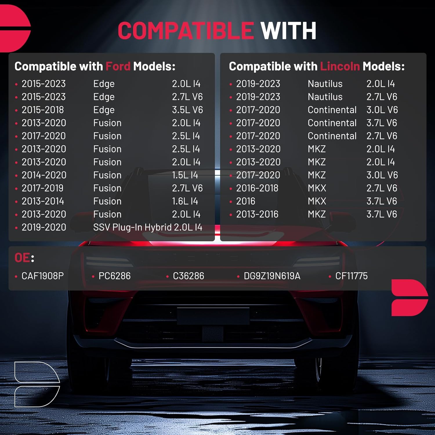 - [Vehicle Fitment] Compatible with Lincoln Models: 2017-2020 Continental 2.7L/3.0L/3.7L V6, 2016-2018 MKX 2.7L V6, 2016 MKX 3.7L V6, 2013-2020 MKZ 2.0L l4, 2017-2020 MKZ 3.0L V6, 2013-2016 MKZ 3.7L V6, 2019-2023 Nautilus 2.0L l4/ 2.7L V6; Compatible with Ford Models: 2015-2023 Edge 2.0L l4/ 2.7L V6, 2015-2018 Edge 3.5L V6, 2013-2020 Fusion 2.0L/2.5L l4, 2013-2014 Fusion 1.6L l4, 2014-2020 Fusion 1.5L l4, 2017-2019 Fusion 2.7L V6, 2017-2020 Fusion 2.5L l4, 2019-2020 SSV Plug-In Hybrid 2.0L l4