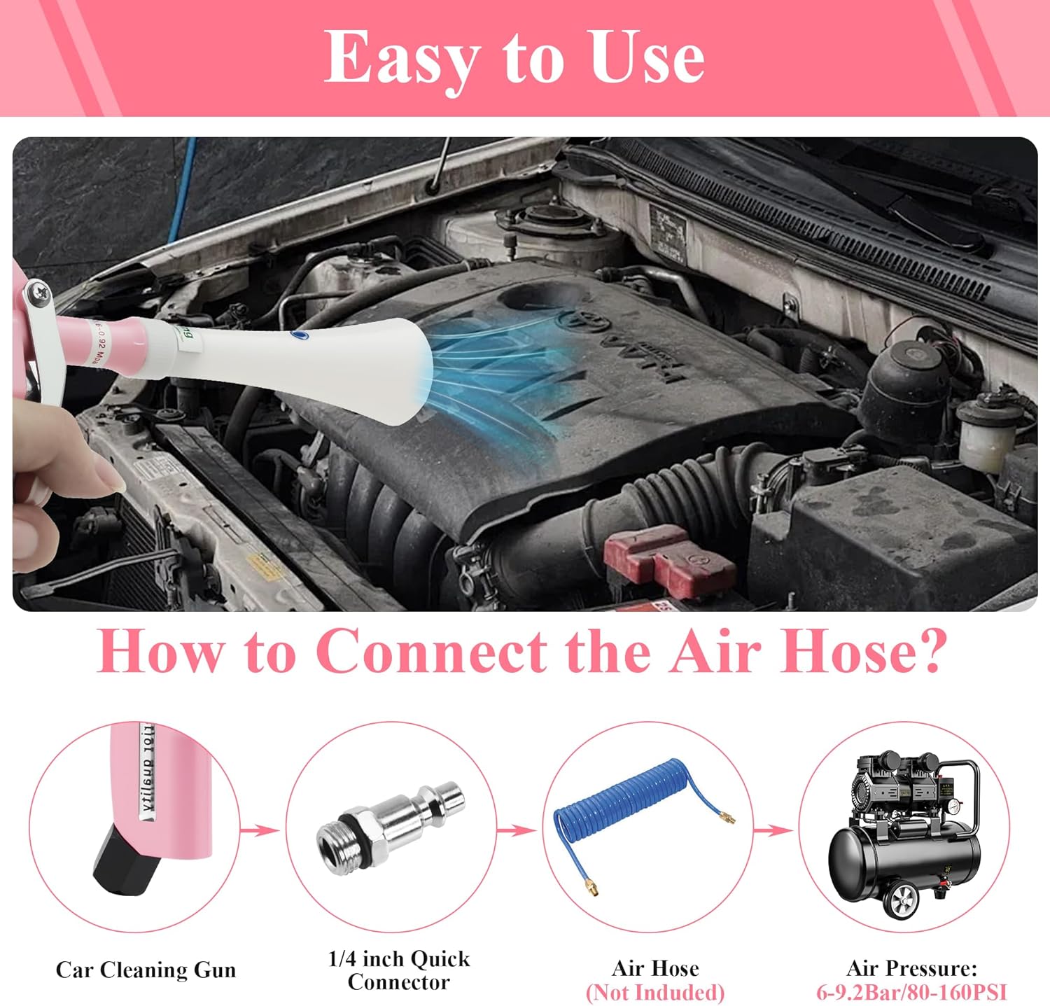 - Easy To Use: Advanced high-pressure cleaning tool, to be used with an air compressor, can quickly clean the car. Cleaning your car is a four-step process: 1. Remove the car cleaning gun from the package and check the accessories, such as adapters, brushes, etc. 2. Take the appropriate adapter and connect it to the air compressor. 3. Check that the pressure is between 6-8kgf/cm² (0.6-0.8bar), do not exceed 10kgf/cm².3. Keep the car cleaning gun at a distance of 1-10 centimeters from the object to be cleaned.4. Keep it away from children, and do not point it at people during use.