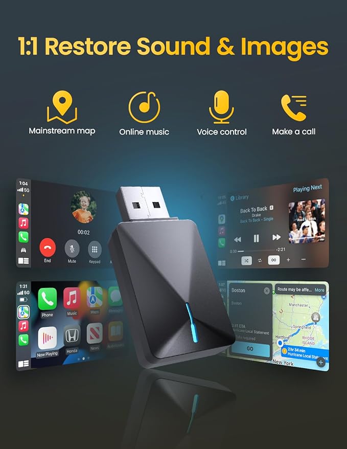 - 【Optimized Auto Connection】: Featuring an advanced chip and 5.8GHz WiFi module with upgraded Bluetooth technology, the adapter ensures instant, stable connectivity for calls and navigation, with minimal delay. The first connection takes just 8 seconds, and subsequent connections are made in 2 seconds.