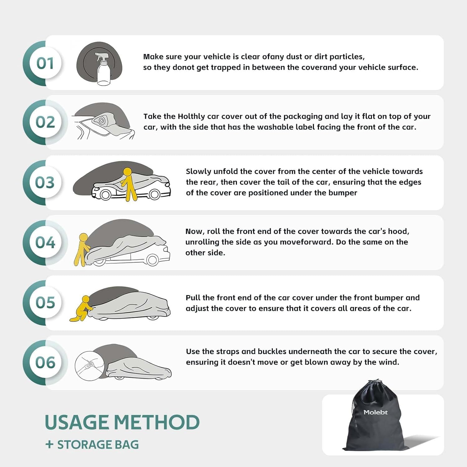 - ăHIGH-QUALITY MATERIALă:Molebt car cover is made of high density polyester, More wear-resistant and tear-resistant. 1800mm water pressure keeps the cover 100% waterproof. Light weight is easy to put on and take off.