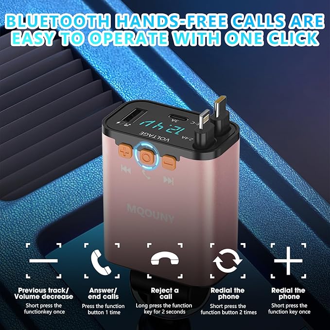 - PD Retractable Cables - To enhance your driving experience, our fm transmitter includes a 50 W USB C and a 12 W USB iPhone retractable cable, eliminating the need for extra cords and effortlessly charging for both Apple and Android devices. The retractable cables of car charger extend up to 80cm and retract smoothly for a tidy car interior