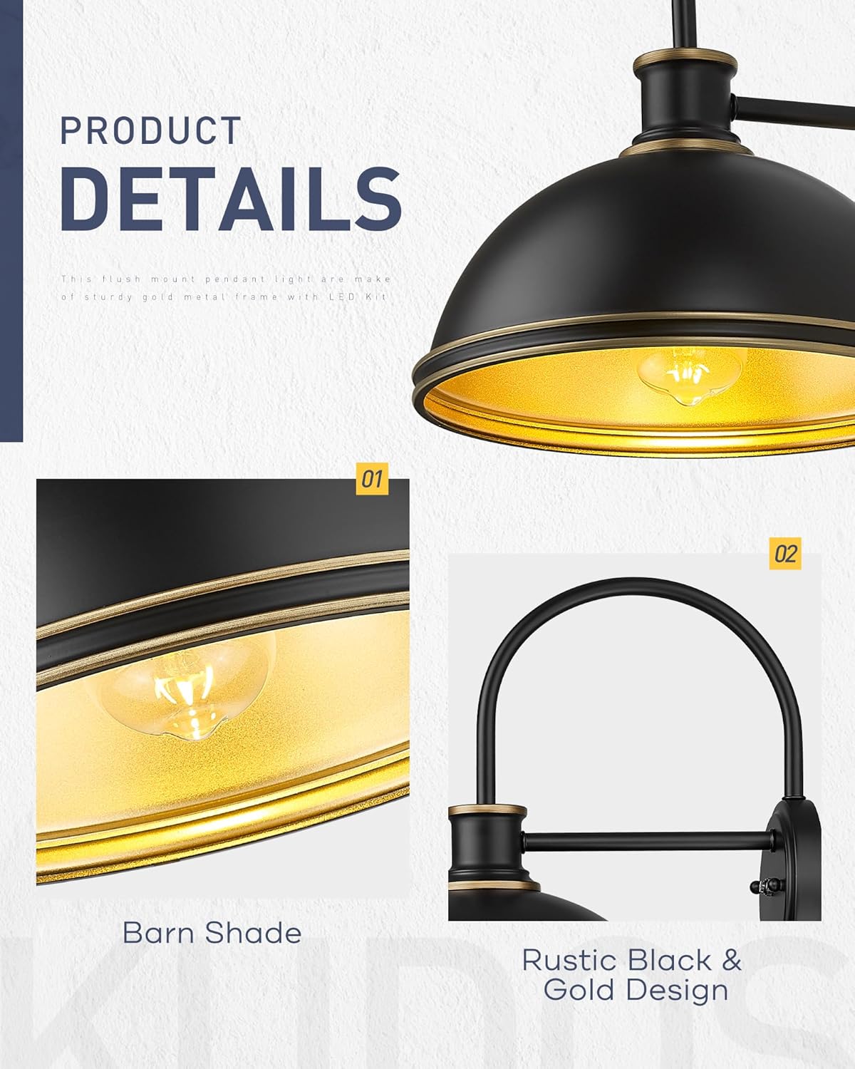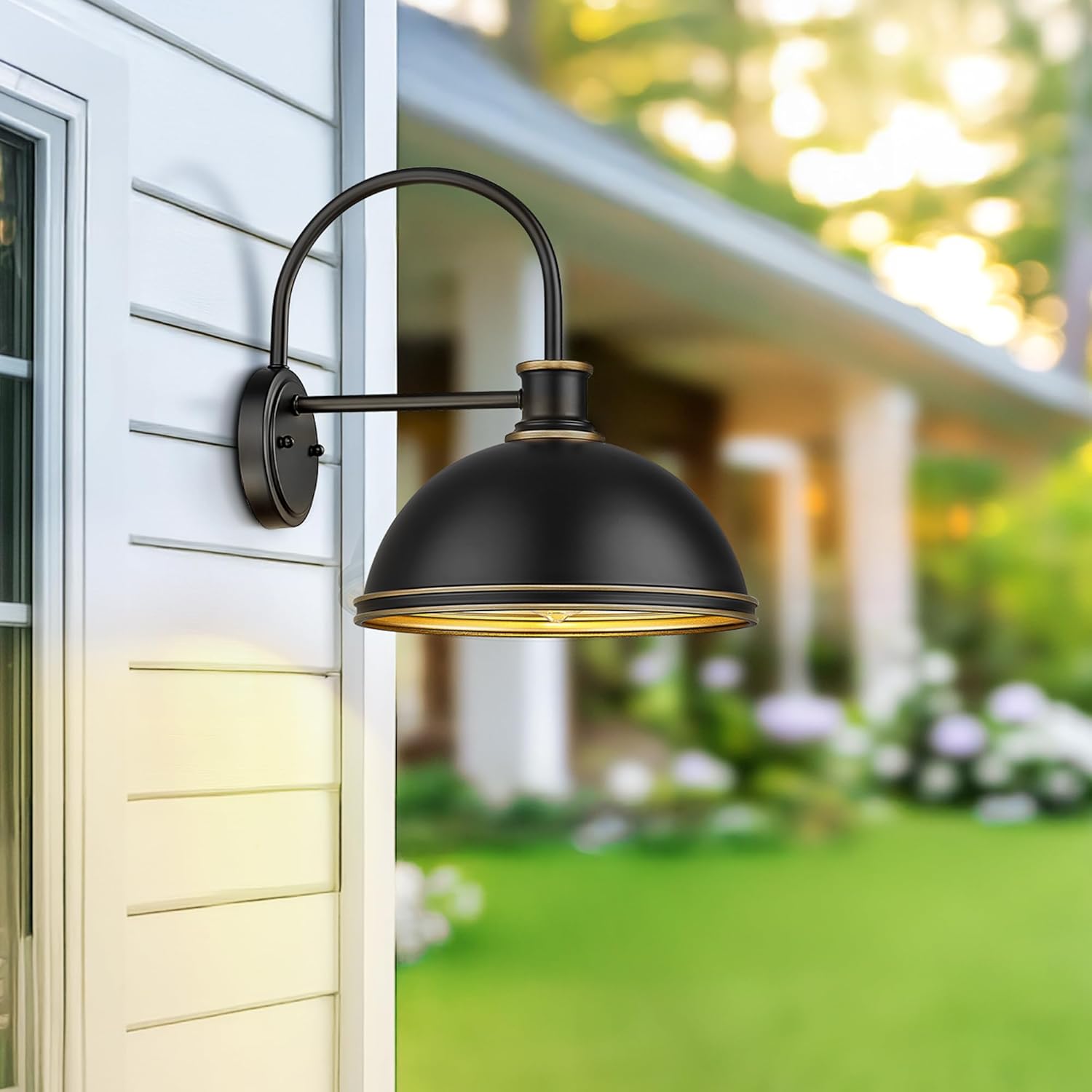 - Bring rustic charm and industrial elegance to your home with this farmhouse-style gooseneck outdoor front porch light. Featuring a classic matte black finish on the outside and a soft gold tone inside, Perfect for both indoor and outdoor spaces like porches, garages, patios, hallways, bathrooms, or kitchens.