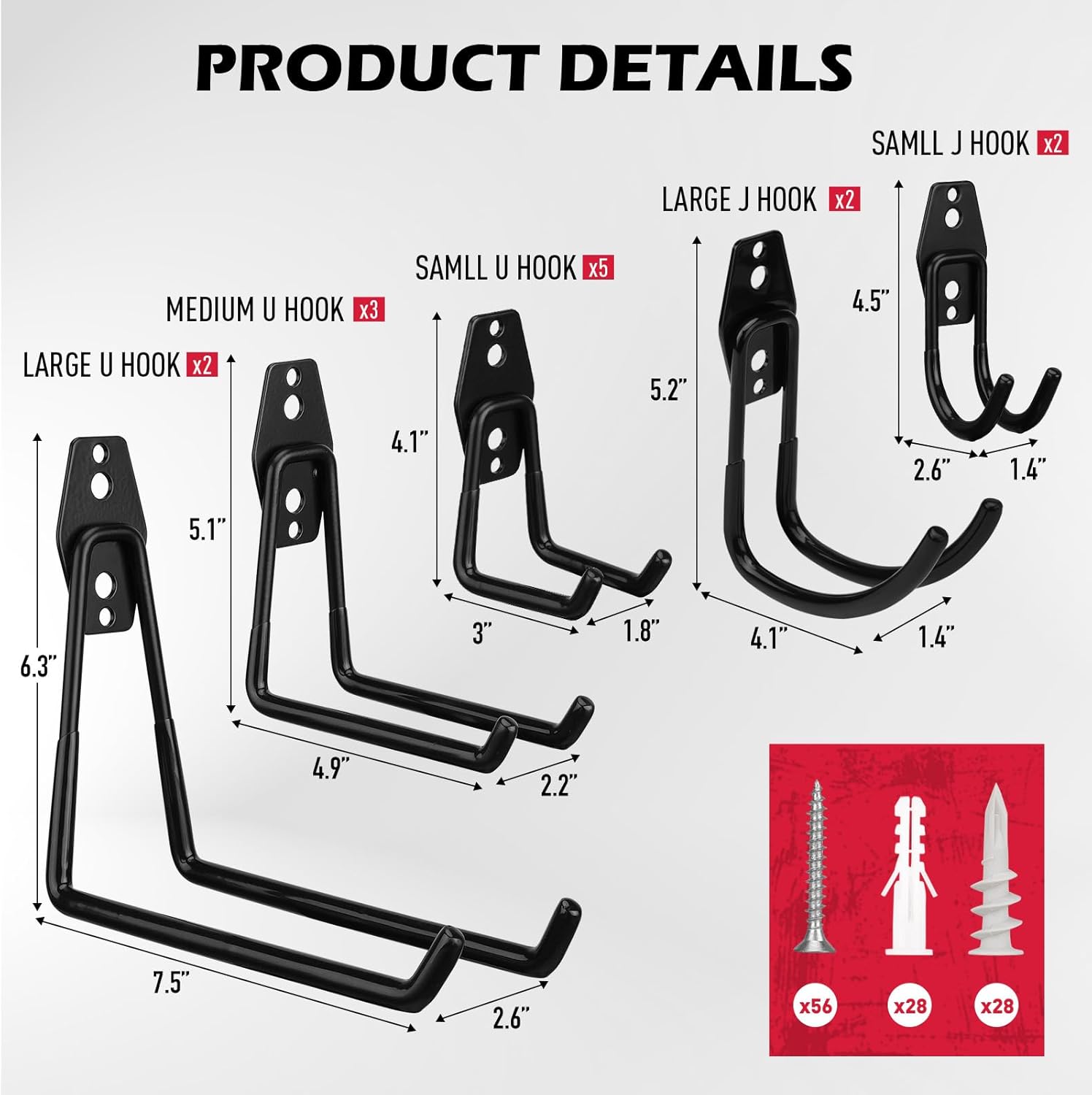 - EASY INSTALLATION - The included screws and anchors make mounting a breeze. Whether you're working with wood, concrete, or plaster, you can easily install these wall mount hooks to create an organized garage storage system