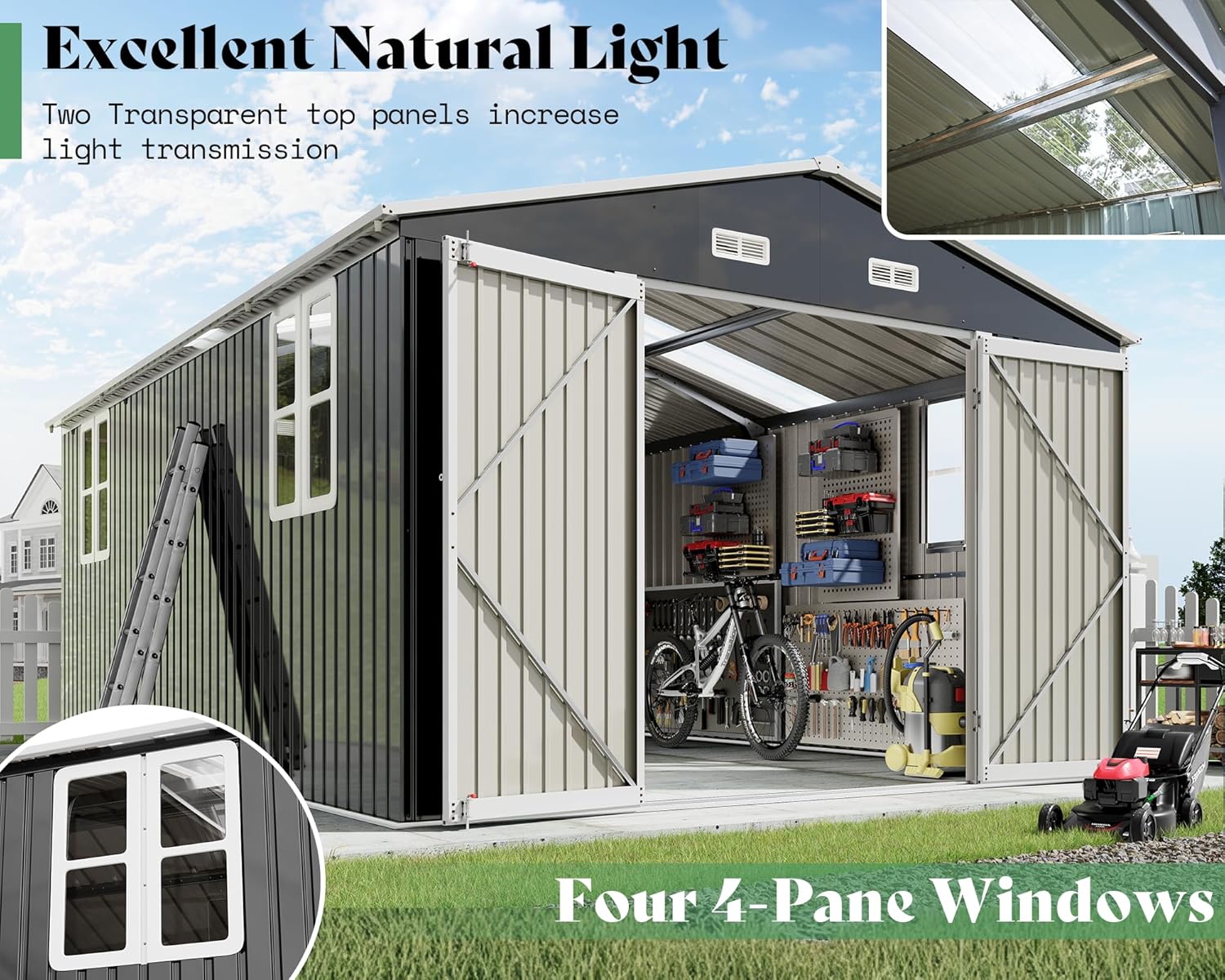 AMERLIFE 10x16.3x7 FT Galvanized Steel Storage Shed with Dual Transparent Panels, 4 4-Pane Windows & Hinged Double Doors, Outdoor Shed for Backyard, Garden, Patio, Dark Grey/White