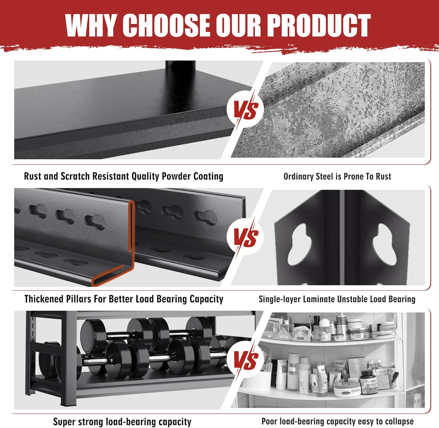 - ăSuperb Weight CapacityăEngineered with industrial-grade cold-rolled steel for superior strength and weldability, this heavy duty garage shelving unit outperforms wooden racks prone to warping or moisture damage. Reinforced crossbars and stabilizing braces ensure unwavering stability, even under heavy loadsâno wobbling or bending over time