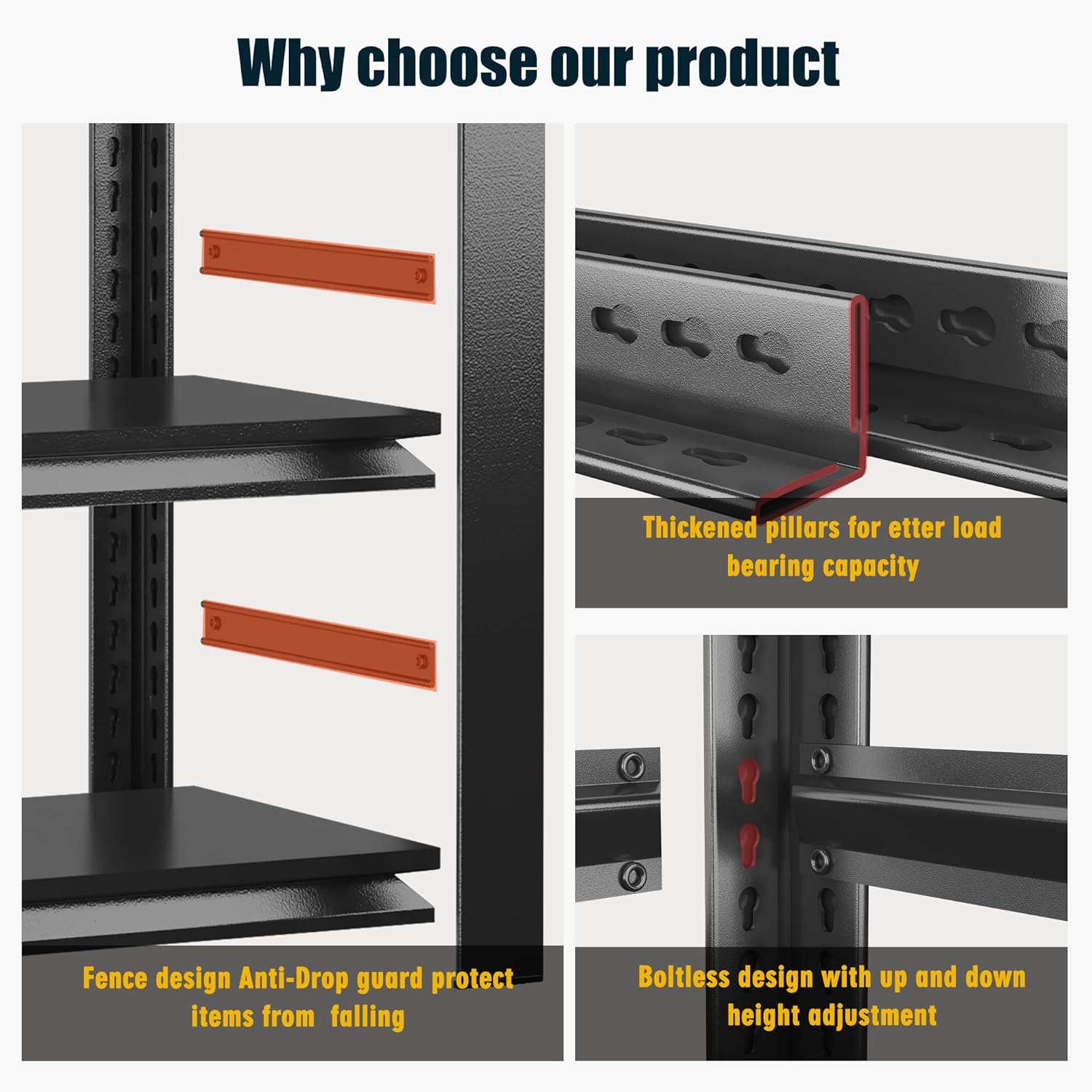 - ăExtremely Sturdy & Durable Garage ShelvingăConstructed from high-strength premium cold-rolled steel with advanced powder-coated technology, this metal shelving unit resists rust, oxidation, and wear. The industrial-grade coating not only enhances aesthetics but also boosts durability, making it a heavy duty garage shelving solution for long-term use