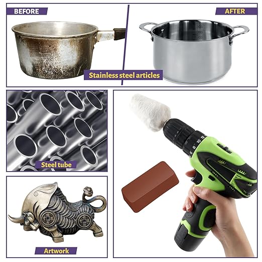 - Broad Scope of Applications: buffing compound and wheels are available for many items, like automobiles, hardwares, metal, brass, stainless steel, aluminum, motorcycle wheels, manifolds, steel, iron, aluminum alloy, brass, bronze, silver, gold, jewelry, and so on, helping you on polishing, cutting, waxing, cleaning, repairing, refurbishment, raising your efficiency on these works