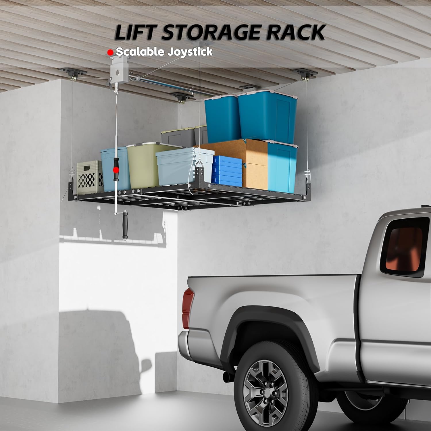- Crafted from heavy-duty steel with anti-rust powder coating,this storage lift has been rigorously tested for safety and durability,supporting loads up to 400 lbs for reliable,long-lasting performance. It also features a generous 4x4 ft storage platform,Garage storage lift suitable for installation on 12 inch,16 inch,or 24 inch ceiling beams with spacing on garage ceilings,providing ample space for your items.