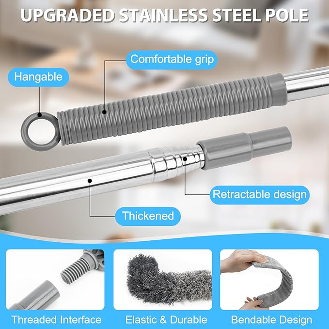 - Upgraded Thickened Retractable Stainless Steel Pole: Our premium stainless steel telescopic extension pole from 30 to 100 inches, allowing you to clean high ceilings, ceiling fans, chandeliers, and hard-to-reach areas without dangerous ladder climbing. The sturdy construction prevents unwanted rotation during use, ensuring precise control and safety during cleaning tasks.