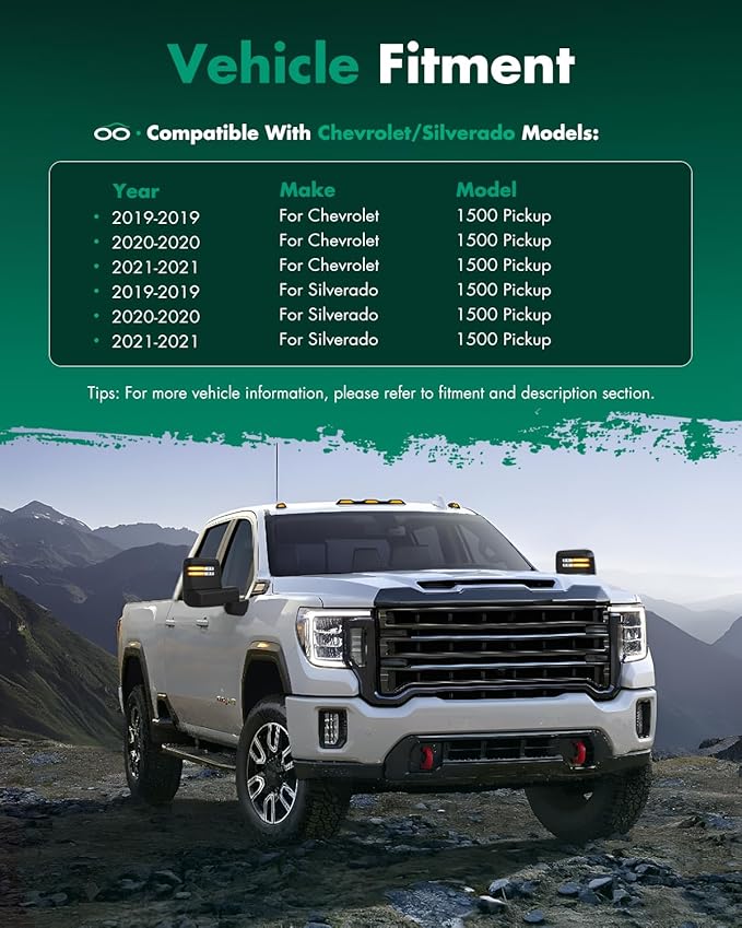 - [Tow Mirrors Fitment]: Compatible with 2019 For Chevy Silverado 1500 Pickup,2020 For Chevy Silverado 1500 Pickup,2021 For Chevy Silverado 1500 Pickup,2022 For Chevy Silverado 1500 Pickup