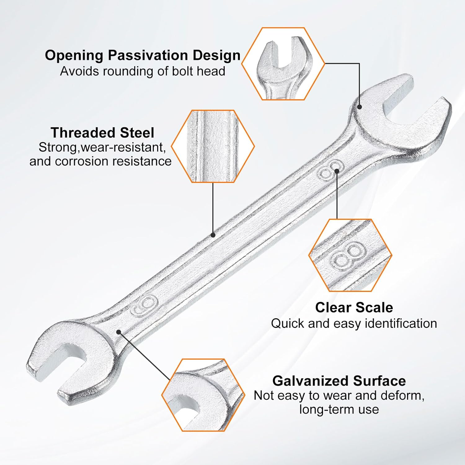 - Size - Metric Open End Size: 6mm x 8mm; Total Length: 110mm / 4.33"; Handle Width: 11mm / 0.43". Handle Thick: 3.5mm / 0.14". Size stamped on both ends of the handle for quick identification
