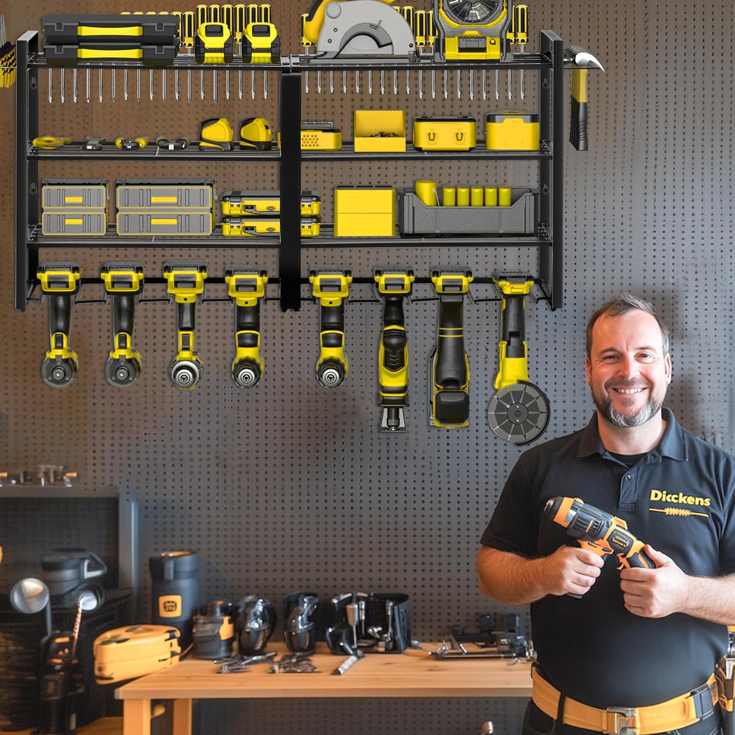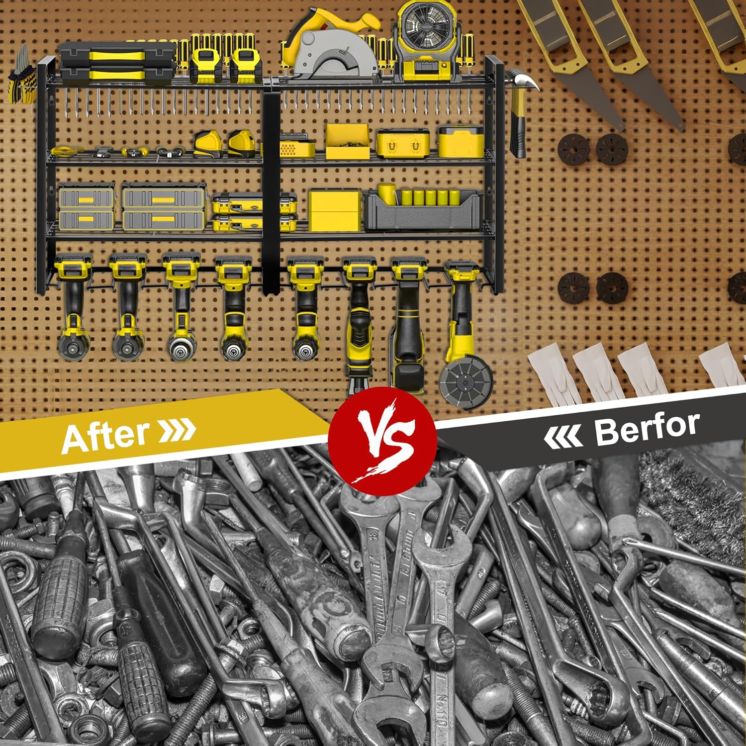 Metal Power Tool Organizer,Space-Saving Wall-Mounted Power Tool Rack,Holds 8 Drills + 4-Tier Storage,Durable Steel Construction for Garage, Workshop and Shed Organization