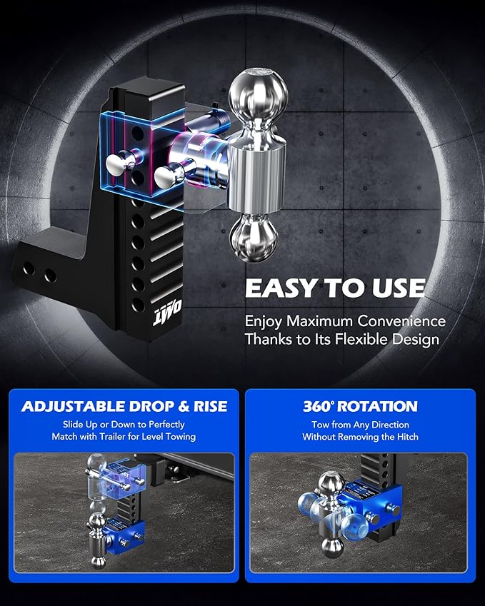 - Effortless Adjustment: Simply lock the hitch in place with the included pins and go. The dual balls rotate 360° and slide up or down 8 in. so you can perfectly match your trailer's height without any hassle