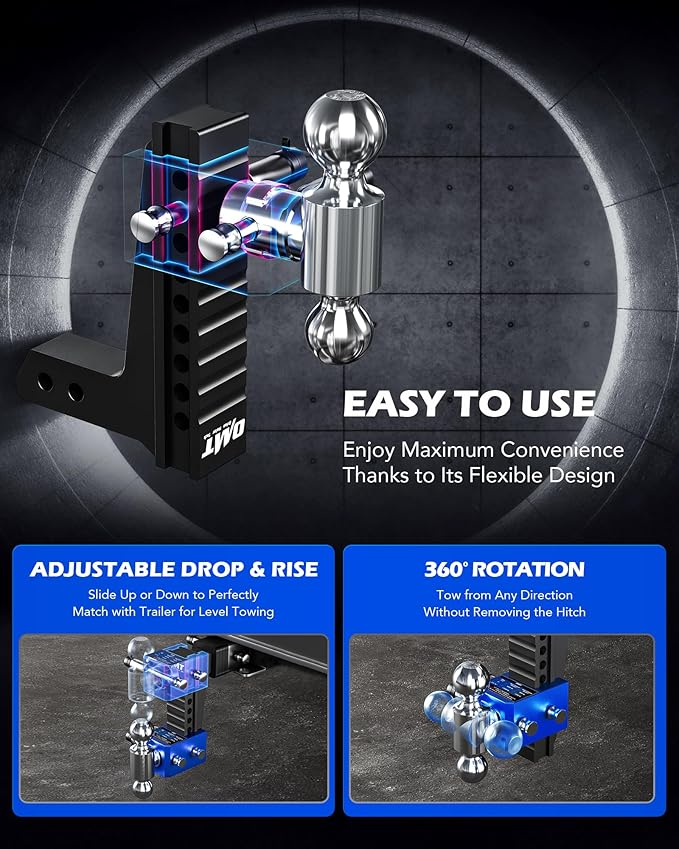 - Effortless Adjustment: Simply lock the hitch in place with the included pins and go. The dual balls rotate 360° and slide up or down 8 in. so you can perfectly match your trailer's height without any hassle