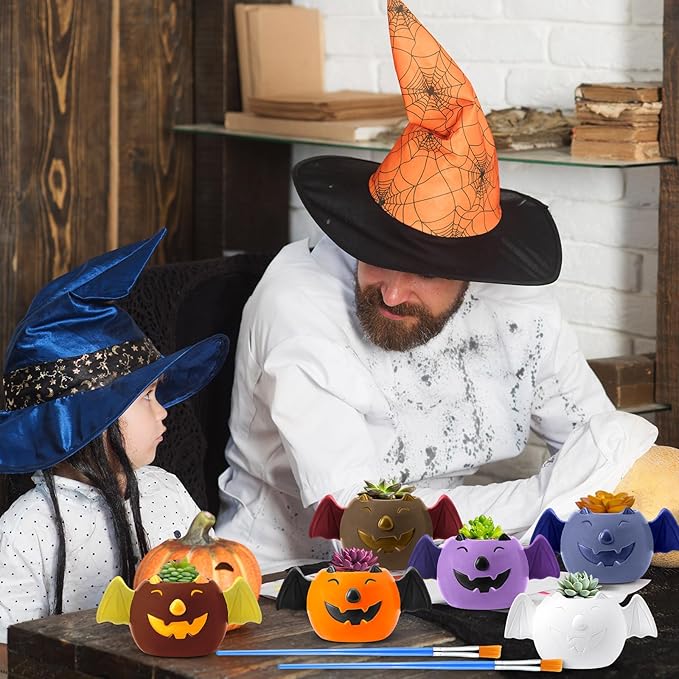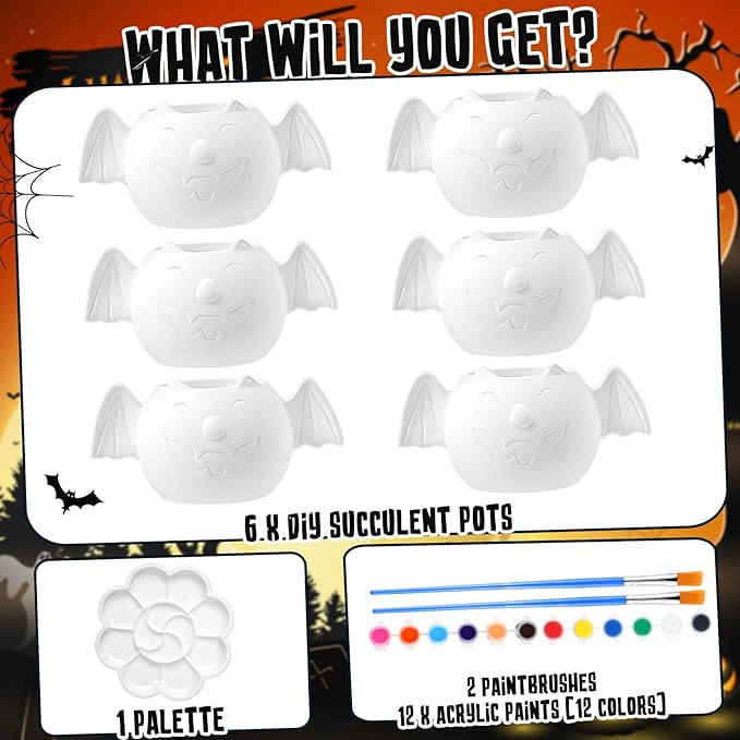 - Sufficient Quantity: you will receive 6 sets of halloween ceramic painting kit, includes 6 pieces of unpainted bat flowerpots, 12 colors of mini acrylic paints, 2 pieces of paint brushes and 1 piece of palette, enough in quantity everything you need to unleash your inner artist