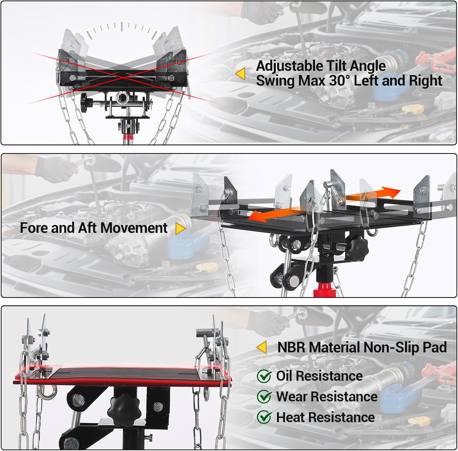 - ă1322 LBS Load Capacityă- This hydraulic transmission jack is engineered from robust carbon steel, ensuring exceptional durability and strength, and maximum load capacity is up to 1322lbs. Its wide base provides enhanced stability, while the two heavy-duty safety anchor chains securely hold the load in place, allowing for safe and efficient transmission service. In addition, it comes with an 8MM thick anti-slip pad to ensure safe load.