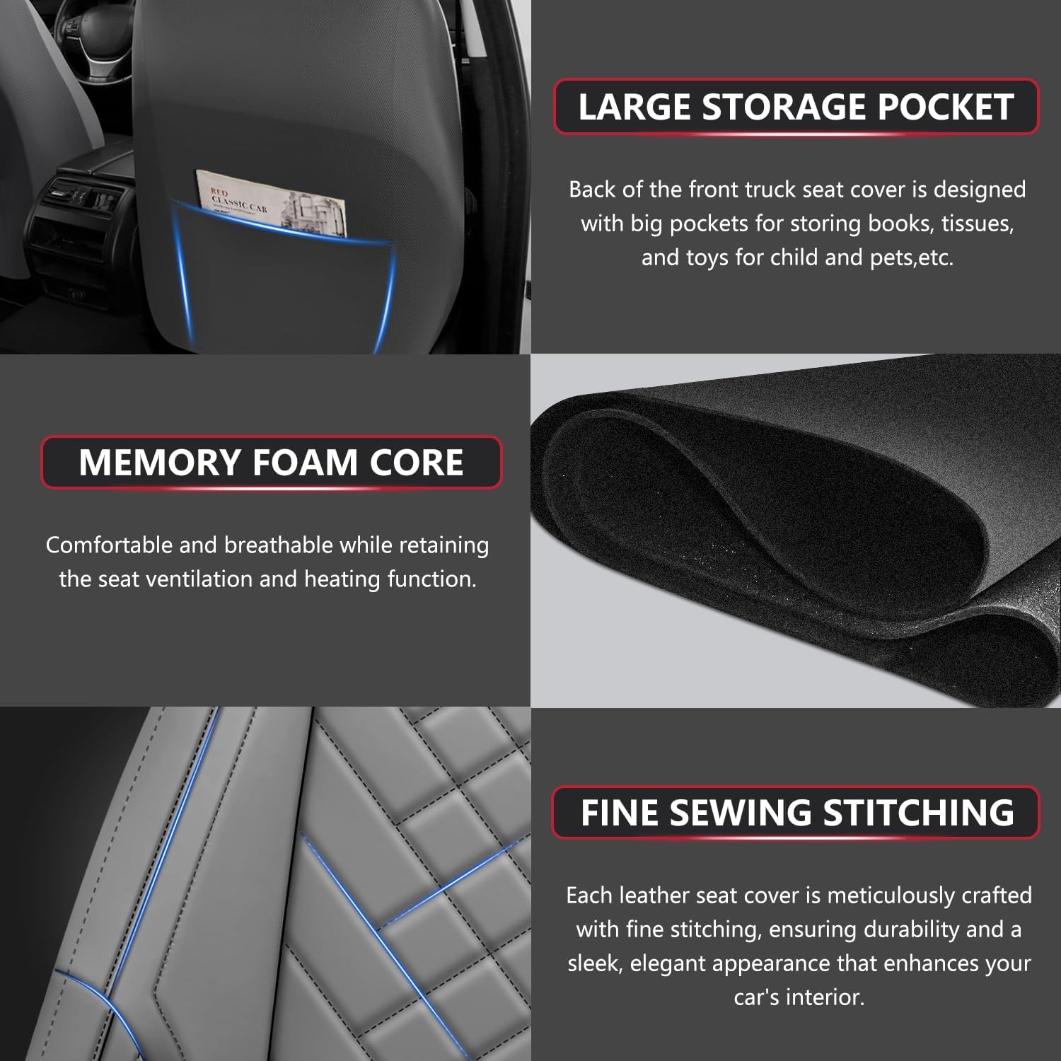 - This front silverado truck seats cover is airbag and seat buckles compatible, it will not effect the original functions of your truck. No movement and wrinkles after installed. Storage pockets are design on the back for easily store things like cellphone and magazines, increasing your truck storage.