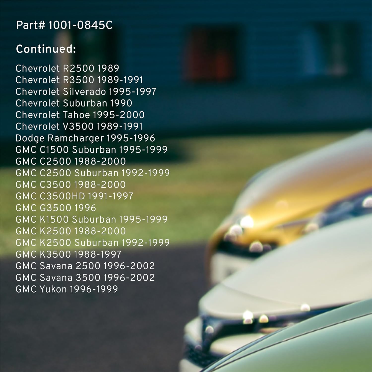 - FITMENT LIST: Select Models 1988-2002 CHEVROLET/ GMC/ DODGE (1001-0845C) Verify Fitment using AmazonConfirmedFit tool.