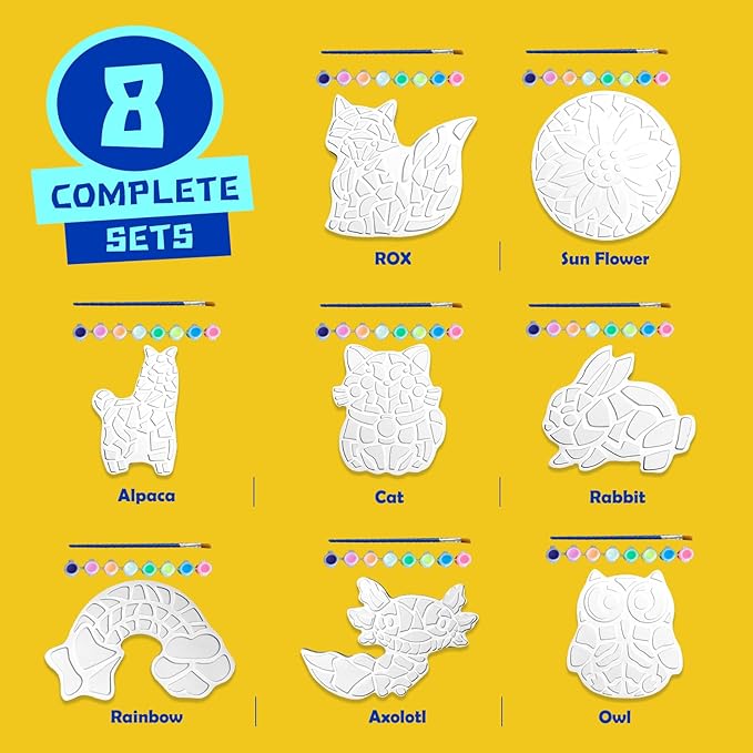 - 8 Unique Plaster Mosaic Designs Used for Creative Art Projects: This stepping stone painting 7 year old arts and craft girls kit for kids comes with 8 detailed and fun plaster designs, including Sun Flower, Rabbit, Rainbow, Axolotl, Fox, Cat, Owl, Alpaca making it the perfect screen-free activity for kids. Ideal for creating kids’ hand-painted stepping stones that can be displayed indoors or outdoors