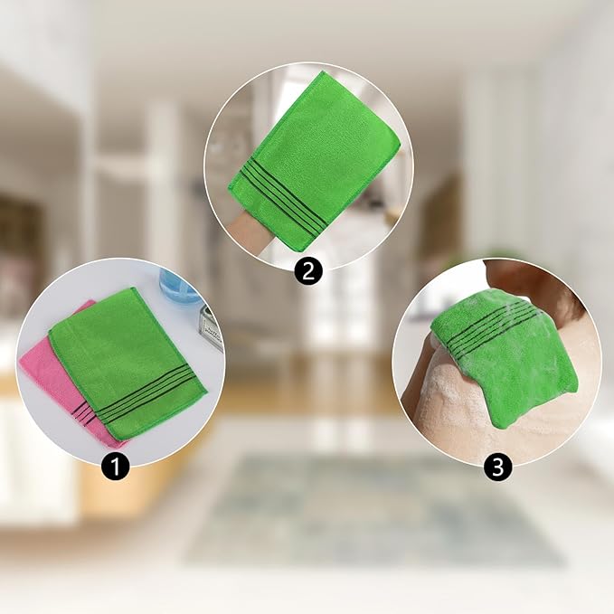 - 12 Pieces korean exfoliating mitt, 6 green and 6 pink. The washcloth effective at exfoliating skin and removing dead skin