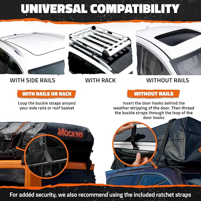 - All-In-One Car & Suv Top Cargo Storage Set: More interior space & less hassle! Our car rooftop cargo carrier bag is built for vehicles with or without racks, offering a secure way to transport extra cargo & increase passenger comfort. The waterproof luggage bag for car overhead storage includes top car storage accessories to provide a safe & convenient ride. When not in use, pack the soft rooftop cargo carrier away in the included carry case. Travel smart with the Mockins Cargo Carrier Bag !