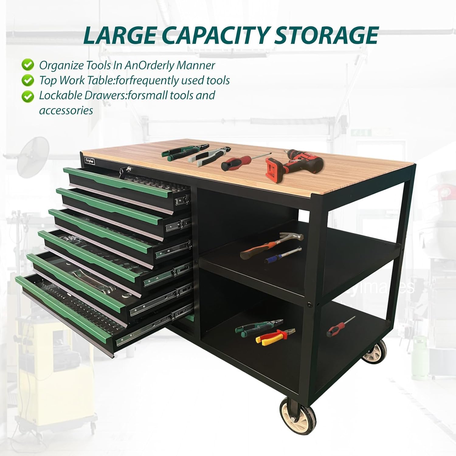 - Generous Storage: Includes 7 lockable drawers and double shelves, providing ample space for tools, equipment, and outdoor work essentials.