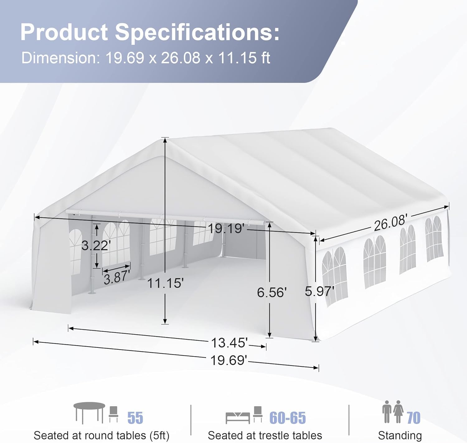 - Reinforcement Structure: Heavy-duty, rust & corrosion resistant 38mm white powder coated steel framework party tent, the height of the canopy sides is 5.97' and the peak height is 11.15'