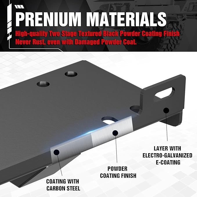 - 【Material】Our winch mounting plate is made of high-quality heavy-duty steel for durability. The surface is coated with a durable black powder coating, which is rust-resistant, corrosion-resistant and wear-resistant.