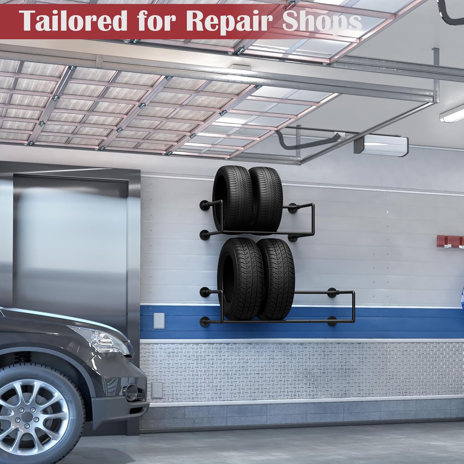 - 【Versatile Storage Solution】This garage tire rack is designed to accommodate various tire types, including seasonal, RV, and ATV tires. Fits seamlessly in home garages, professional repair shops, apartments and storage sheds, offering reliable organization for all your tire storage needs. Plus, you can add your own wooden boards on top to make it into a handy shelf for more storage.