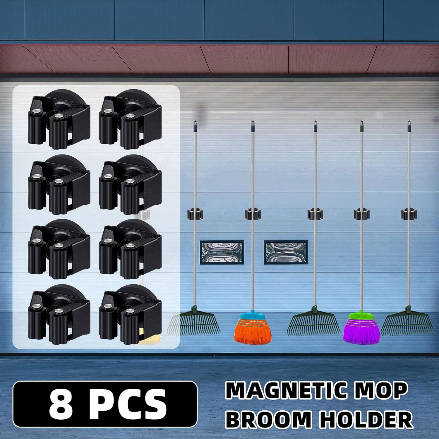 8 Pcs Magnetic Mop Broom Holder Movable Magnetic Broom Holder Rack, Anti Slip Wall Mounted Utility for Cleaning Tools, Garage, Kitchen, Laundry, Garden (Black)