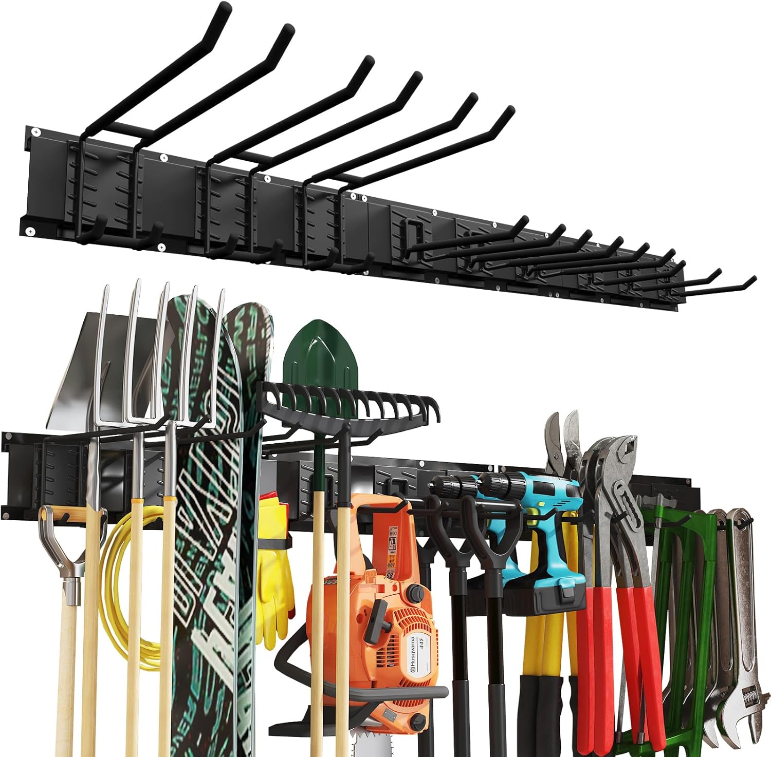 - Heavy Duty & Sturdy: Crafted from premium quality, heavy-duty alloy steel materials, our tool rack boasts an impressive 660 lbs weight capacity – strong enough to hold even your heaviest equipment. The double powder-coated finish resists rust, scratches, while rubber-coated hook arms prevent slipping and protect tool surfaces from dents, long-lasting and sturdy.