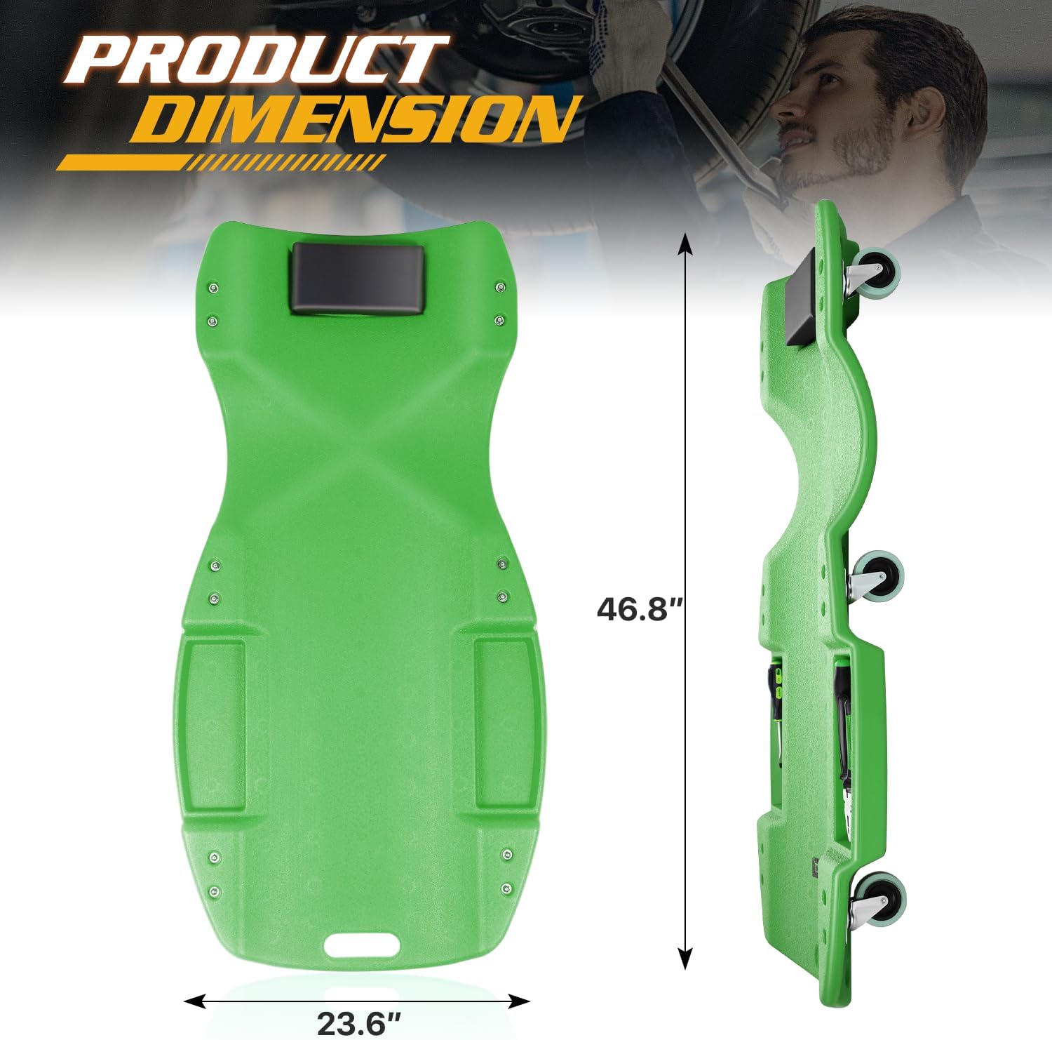 - The creeper measures 23.5"(D)×46.5"(W)×5"(H), has six 2.5" diameter wheels, and tool trays on both sides for your convenience.