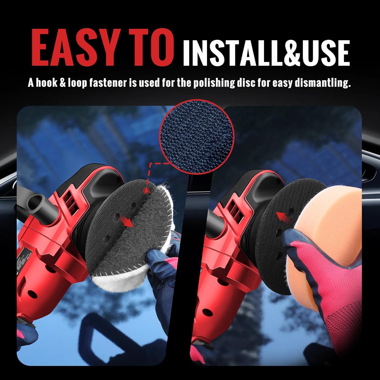 - ăWIDE APPLICATIONSăSpecially designed for professionals and beginners, the automobile polisher is equipped with three polishing pads of various types:(Flat Foam and Wave Foam Pads; Woolen Polish Pads; 2000 Grit Sandpapers),Suitable for all kinds of work such as sanding, removing swirls, scratches, and defects on all painted vehicles. You can also use it on furniture, ceramics, wood, and metal. to satisfy your polishing needs for diverse scenarios. The velcro-backed polishing plates allow you to change accessories in seconds.