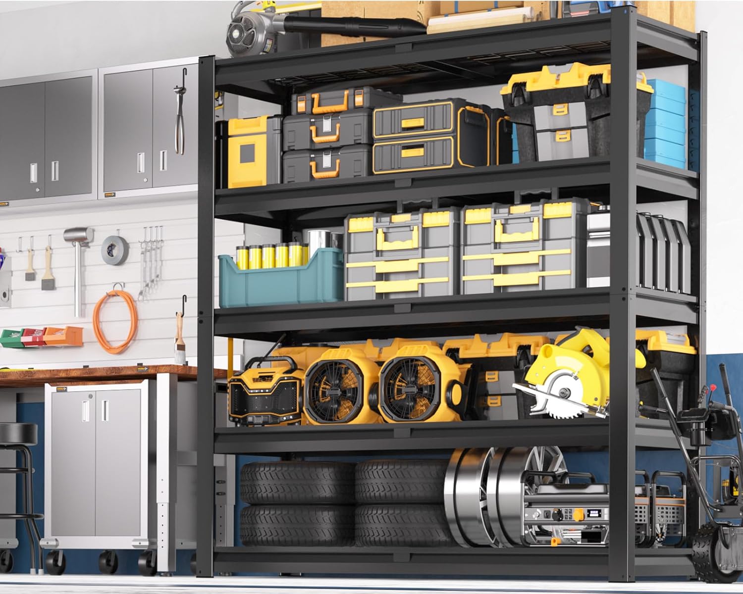 - ăEasy Assemble within 10 Minutes ăThe metal storage shelves adopt a bolt-free interlocking design and can be quickly assembled in just 10 minutes. It comes with a rubber mallet and gloves to make the installation process simple and efficient. Tips: Evenly distribute the items on each shelf to ensure the stability and load-bearing capacity of the garage shelves.