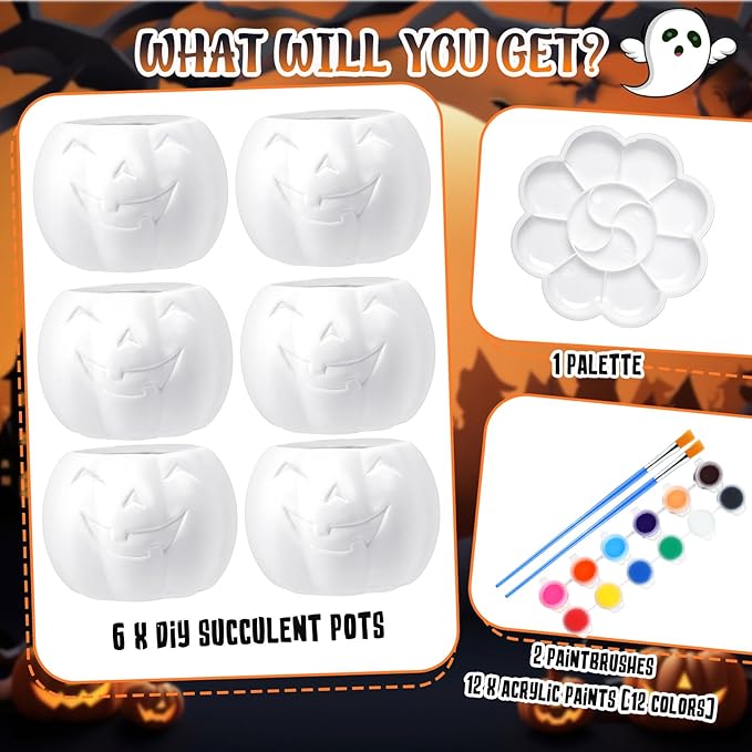 - Sufficient Quantity: you will receive 6 sets of halloween ceramic painting kit, includes 6 pieces of unpainted pumpkin flowerpots, 12 colors of mini acrylic paints, 2 pieces of paint brushes and 1 piece of palette, enough in quantity everything you need to unleash your inner artist
