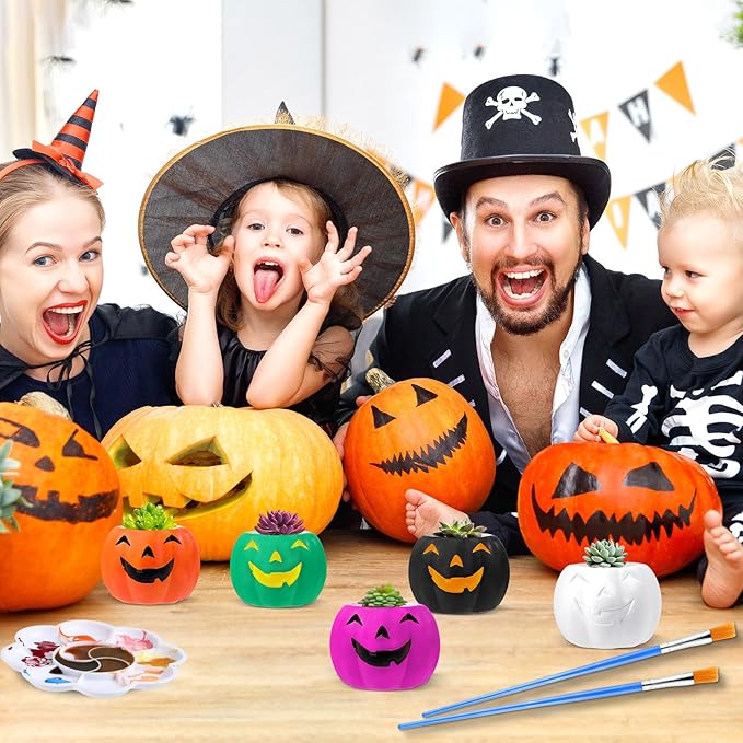 Pasimy 6 Set DIY Ceramic Succulent Planter Pots Paint Your Own Flower Pots Craft Kit Unpainted Bisque Paintable Flowerpot with Brush Palette Ready to Paint for Family Activity Gift (Evil Pumpkin)