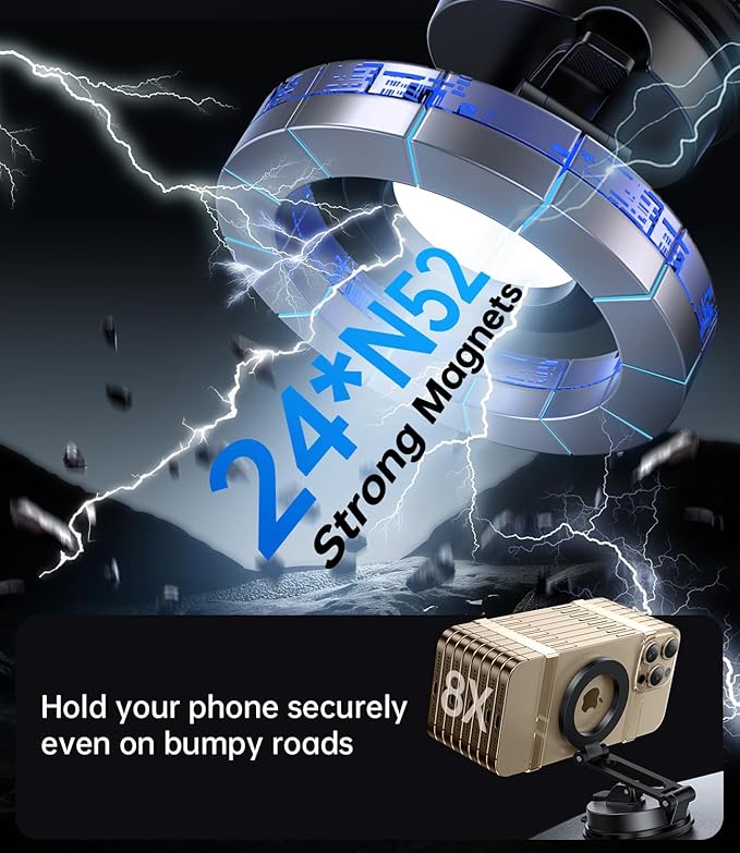 - 【Ultra-Strong Magnetic Force】This ultra-magnetic phone holders for your car is equipped with 24X N52 magnets, delivering exceptional holding power to securely keep your phone in place. After 6000 vibration tests and extreme road simulations, your phone stays secure during bumps, sudden stops, or sharp turns. The precise magnetic design ensures strong adhesion without disrupting phone signals for clear navigation and calls.