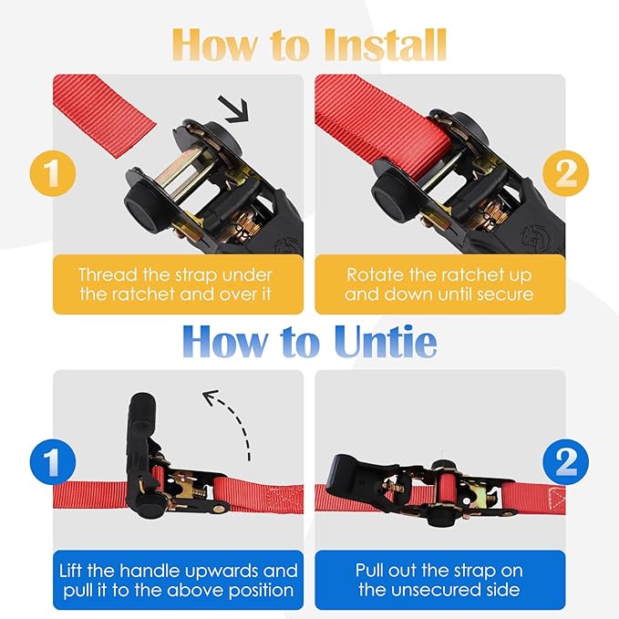 - 【Medium-Duty Ratchet Straps】Built to withstand extreme conditions, our 1-inch wide, 15-feet long ratchet straps feature 1,826 lbs breaking strength. Ideal for trucks, vans, trailers, motorcycles, ATVs, boats, and moving furniture, ensuring cargo stays in place and preventing shifting or damage.