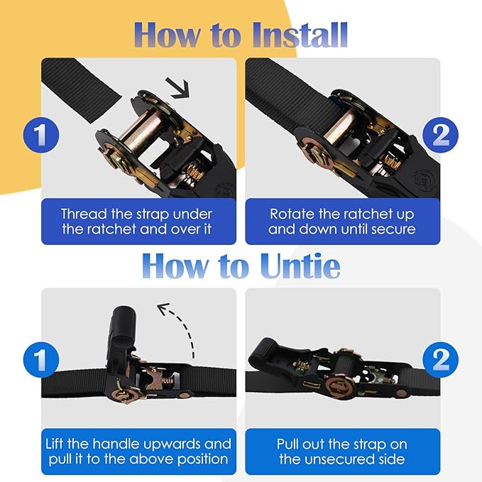 - 【Medium-Duty Ratchet Straps】Built to withstand extreme conditions, our 1-inch wide, 15-feet long ratchet straps feature 2,200 lbs breaking strength. Ideal for trucks, vans, trailers, motorcycles, ATVs, boats, and moving furniture, ensuring cargo stays in place and preventing shifting or damage.