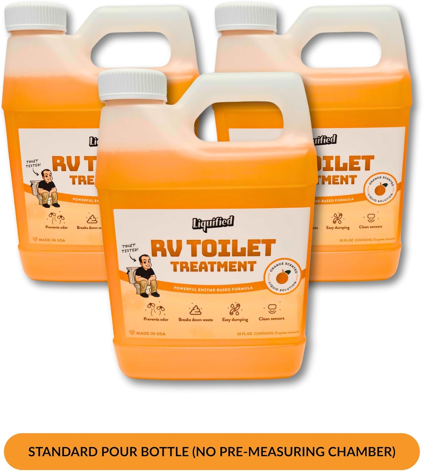 Liquified RV Toilet Treatment - Orange, 32oz Standard Pour Bottles (3-Pack) Odor Control, Waste Breakdown & Septic Safe - Made in USA
