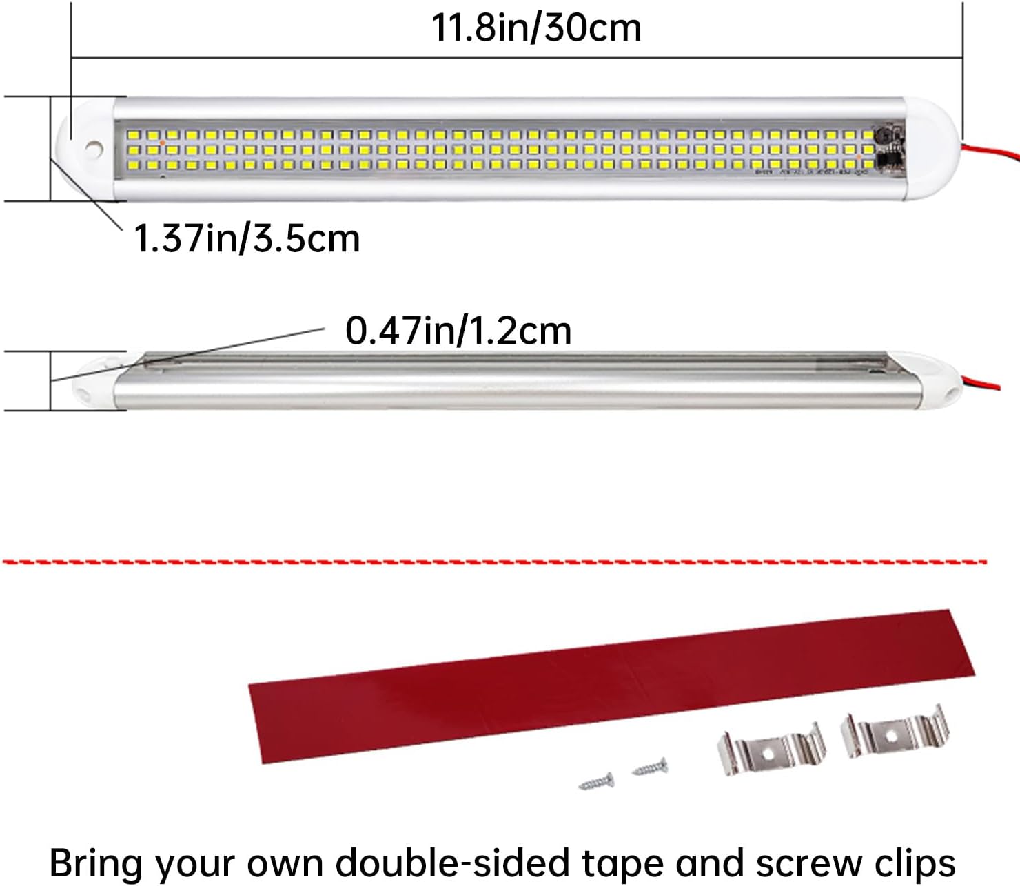 - The package includes 8*12v led lights, 8*strong self-adhesive tape, 16*stainless steel clip and 16*stainless steel screw. And the switch is located at the end of the light bar, which could be conveniently operated any time necessary. This LED car interior light bar approved by multi-security certificates will ensure the safety of you and your vehicle. If you have any questions, please contact us in time and we will help you solve them