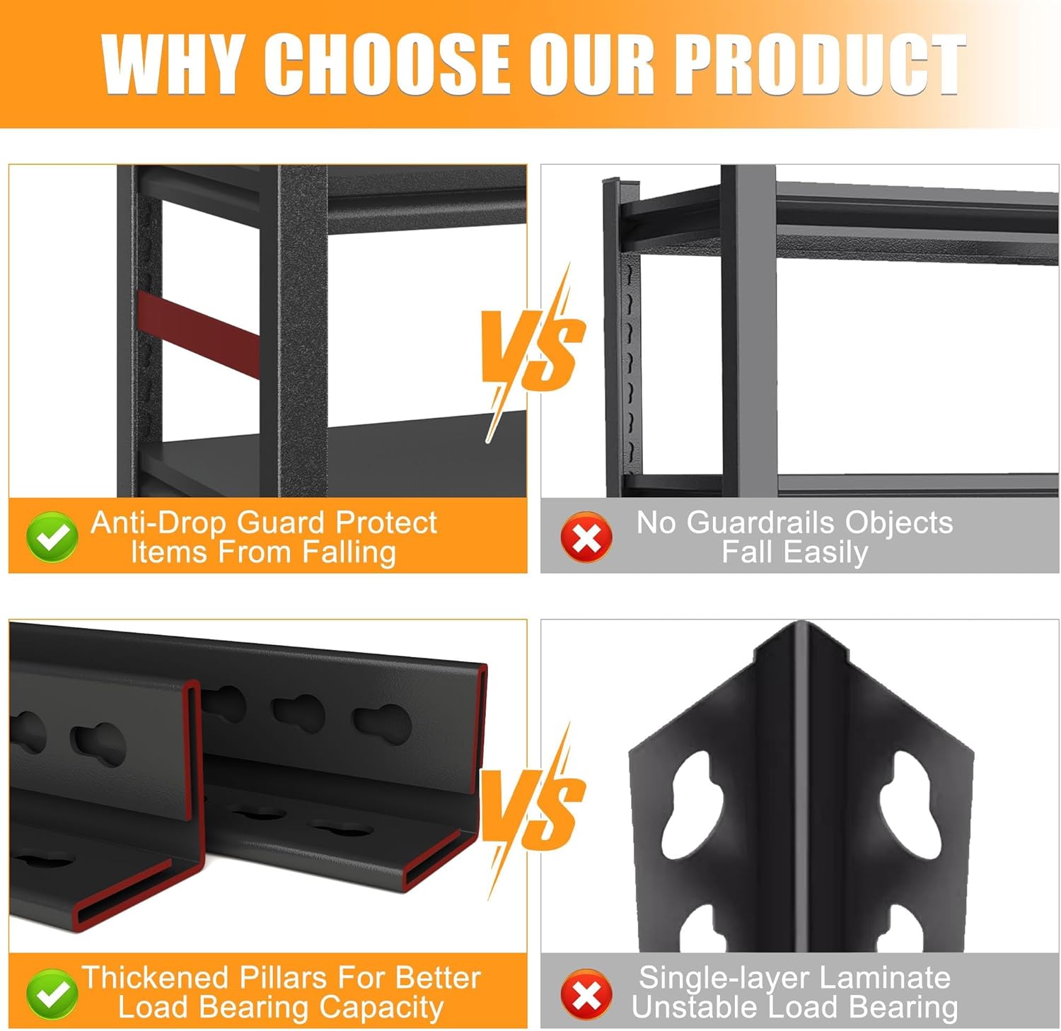 - ăExtremely Sturdy & Durable Garage ShelvingăConstructed from high-strength premium cold-rolled steel with advanced powder-coated technology, this metal shelving unit resists rust, oxidation, and wear. The industrial-grade coating not only enhances aesthetics but also boosts durability, making it a heavy-duty shelving solution for long-term use