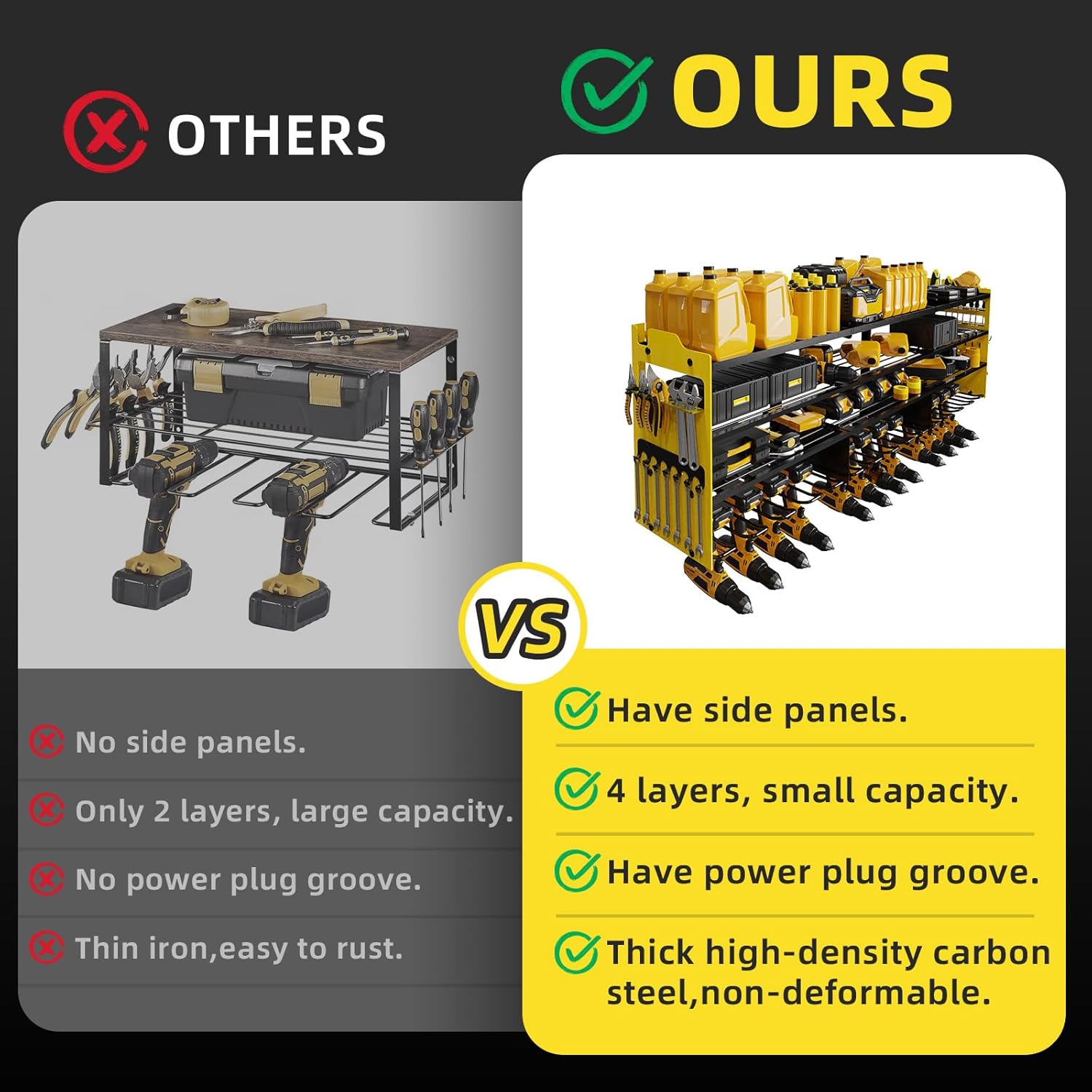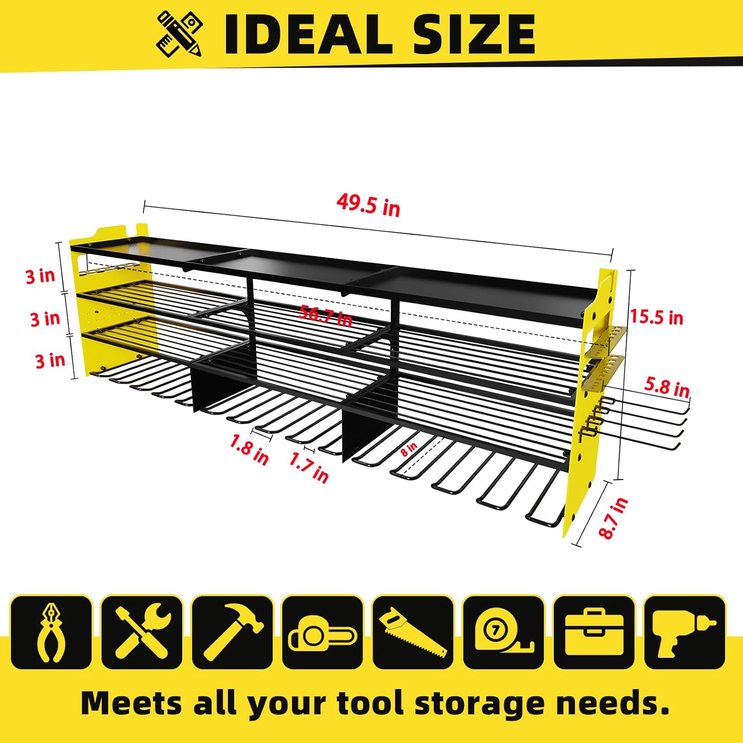 - 🔨【800 POUNDS LOAD】This heavy-duty power tool organizer is made of heavy-duty metal and protective coating,scratch-resistant, rust-resistant and anti-bending,no need to worry about the shelf breaking or falling off the wall. The wall mount design saves valuable floor space while keeping tools within reach,say goodbye to a messy workspace,put your tools all in a row.