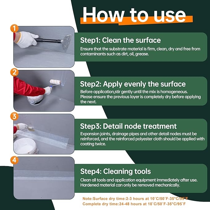 - Coating Sealant Coverage- Simple application(brush, roller)and fast drying. Appling 1 gallon for 72 ft², for better waterproofing, two coats are recommended to cover 36 ft². Ideal for exterior wall or concrete waterproof repair and preventive maintenance of substrates.