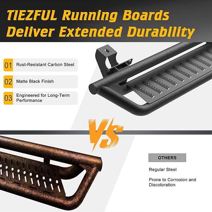 - Solid Construction: The running boards are constructed with heavy duty carbon steel and black powder coating that resists rust and corrosion. Allow 550 lbs loading capacity for each step pad. Built to long lasting