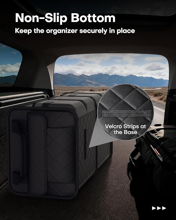 - STABLE NON-SLIP BASE: Designed with Velcro strips at the bottom, this car organizer trunk stays firmly in place without sliding or tipping while driving. It remains steady whether you accelerate, brake, take sharp turns, or drive on bumpy roads. This stability keeps your belongings secure and organized, giving you complete peace of mind on every trip.